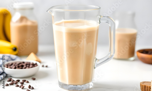 glass pitcher, indoor, food, drink, healthy, ingredient, banana, chocolate chips, presentation, detail, lifestyle, environment, aesthetic, texture, refreshing, casual attire, milk, light, enjoyment, culinary, composition, visual, bright, dairy, smoothie, nourishment, freshness, favor, snack, kitchen, vibrant, banana, dining, receipe, delicious, rustic, epicure, wellness