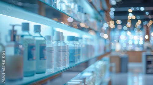 bottle, cosmetic, shelf, store, glasses, blue, light, beauty, skincare, product, serum, display, shop, bright, blur, modern, interior, pharmacy, shopping, health, clean, lotion, transparent, elegant, glow, liquid, organised, commercial, consumer, department, container