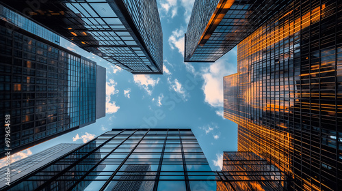 Glass skyscrapers reflecting blue sky and clouds in business district