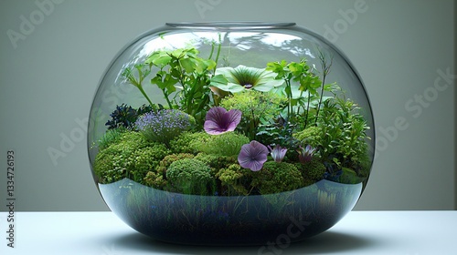 terrarium, plant, glasses, nature, design, home, decor, indoor, garden, aesthetic, modern, style, display, unique, art, botany, moss, foliage, flower, purple, green, light, sphere, round, beautiful, vibrant, life, living, organic, minimalist, space, creative, artistic, composition, detail, lush, growth, delicate, miniature, small