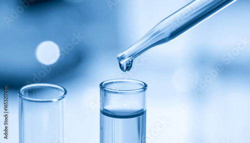 Glass test tube with liquid and pipette. Pharmaceutical research. Laboratory innovation concept.