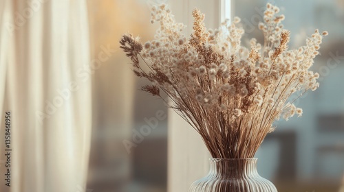 glass vase holding a beautiful arrangement of dried flowers, with soft light highlighting the fine details of the stems and petals.