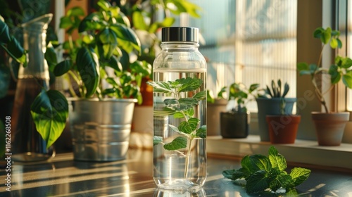 Glass water bottle with fresh mint leaves on a kitchen windowsill, surrounded by potted plants. Sunlit scene.