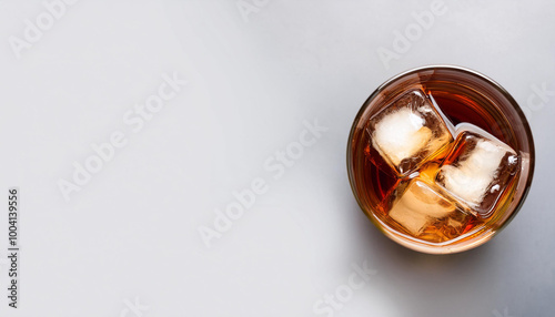 Glass with whiskey or rom with ice cubes. Top view. Copy space.