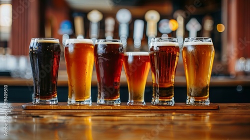 Glasses with different sorts of craft beer on a wooden bar. Tap beer in pint glasses arranged in a row. Close-up of five glasses of different types of draught beer in a pub
