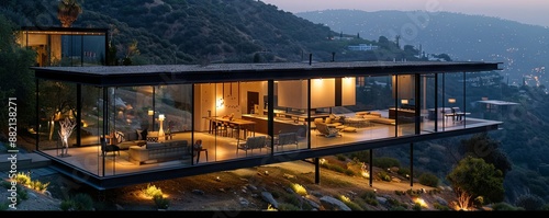 Glass-walled modernist house perched on a hilltop.