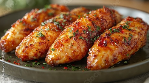 Glazed chicken tenders, arranged on a plate, garnished with parsley, with blurred background