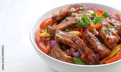 Glazed pork ribs with peppers, studio shot, food photography, recipe