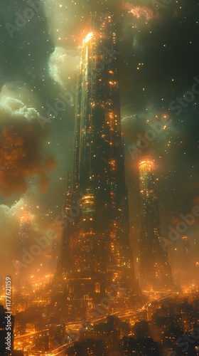 city, architecture, futuristic, science fiction, skyline, city landscape, urban, skyscraper, tower, building, metropolis, landscape, technology, infrastructure, transportation, paseo, tube, dynamism, gleaming, vertical, linked, labyrinth, energy, power, industry, steel, glasses, light, glow, illumination, cloud, smoke, fire, destruction, apocalyptic, surreal, conceptual, digital artwork, modern, contemporary, future, advanced, high technology, industrial