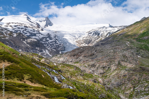 Gletscher am Großvenediger Osttirol Innergschlöß im Sommer mit blühenden Almrosen