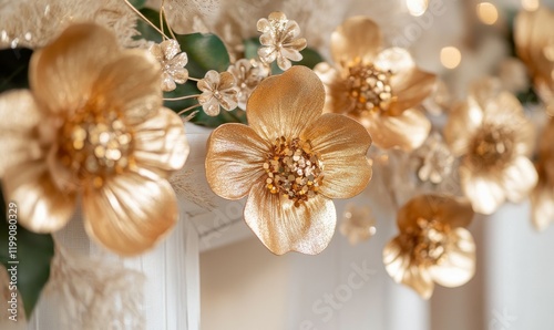 Glittery gold flower garland in a sparkly floral arrangement, floral arrangement, gold