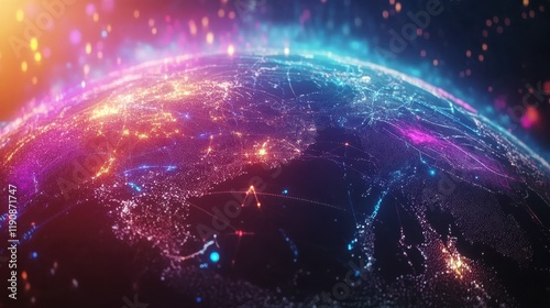 Global connectivity concept depicting a digital network spanning across the Earth with vibrant light connections and technological elements.