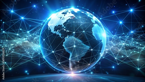 Global connectivity network glowing with blue light, digital world connections, tech innovation
