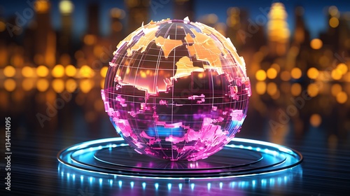 globe, earth, earth, technology, digital, network, connectivity, global, international, interconnected, futuristic, modern, innovation, progress, communication, datum, information, city, light, night, urban, scene, background, platform, illuminated, glowing, transparent, glasses, sphere, pink, purple, orange, blue, colours, high-coloured, three-dimensional, render, graphic, design, visualisation, abstract
