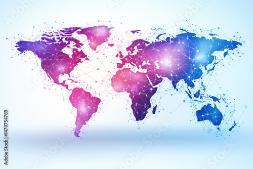 earth, map, network, global, connection, vibrant, colours, gradient, line, point, dot, digital, abstract, design, graphic, illustration, technology, communication, connectivity, international, worldwide, modern, colourful, futuristic, visual, pattern, shape, background, light, blue, pink, purple, contemporary, style, structure, interconnected, globalisation