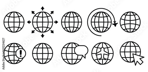 globe, icon, icon, global, earth, cyberspace, web, travel, communication, navigation, technology, digital, network, connection, online, international, location, map, earth, planet, arrow, direction, cursor, click, warning, message, aeroplane, design, symbol, element, graphic, set, collection, bundle, black, white, line, simple, minimal, vector, illustration, isolated, background, geometric, abstract, pattern, graphic
