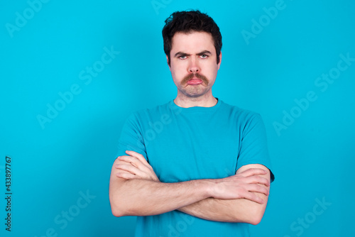 Gloomy dissatisfied young handsome Caucasian man with moustache wearing blue t-shirt against blue background looks with miserable expression at camera from under forehead, makes unhappy grimace