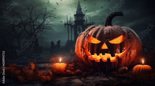 Gloomy Halloween background with spooky pumpkins, spooky Halloween haunted mansion. Generated AI