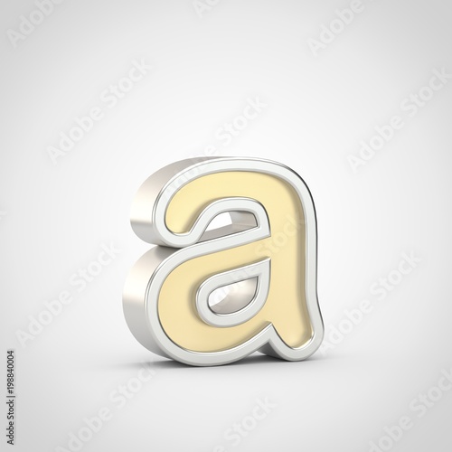 Gloosy golden letter A lowercase with silver outline isolated on white background.