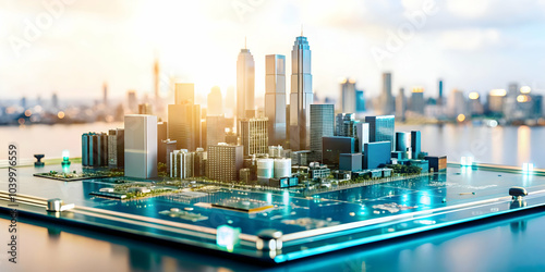 Glossy Circuit Board Background with Transparent Cityscape Overlay Concept for Smart Cities, Highlighting Technological Foundations, Ample Copy Space for Text Placement in Photo Stock