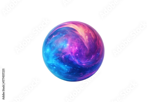 Glossy sphere featuring flowing blue purple pink galaxy patterns with sparkling stellar effects, isolated on a transparent background
