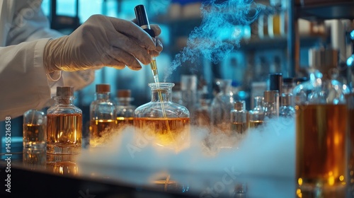 laboratory, science, experiment, chemistry, research, pipette, liquid, amber, bottle, glasses, fragrance, perfume, essential oil, dry ice, smoke, vapour, distillation, process, manufacturing, creation, mixing, precision, careful, detail, professional, scientific, technology, medicals, health care, analysis, testing, investigation, discovery, innovation, development, production, industry, workplace, safety, hygiene, closeup, detailed, indoor, concentrated, focused