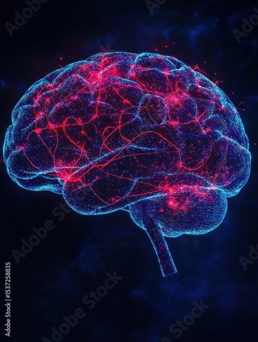 glowing, abstract representation of human brain with vibrant red and blue neural connections, symbolizing mental health, intelligence, and cognitive processes