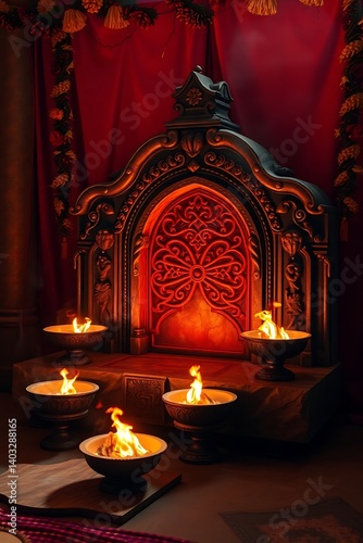 Glowing ancient stone altar surrounded by fire bowls in a warm festive palette