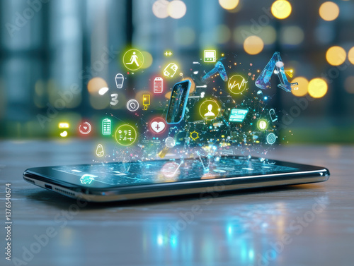 Glowing App Icons Emerging from Smartphone on Wooden Surface