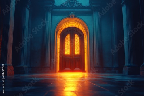 door, light, architecture, entrance, glow, hallway, mystery, warmth, wood, stone, shadow, ornate, design, corridor, atmosphere, inviting, historic, elegant, grandeur, space, colours, texture, depth, ambience, fantasy, surreal, portal, vision, contrast, illumination, perspective, beauty, scene, structure, opulence, heritage, artistry, entranceway, luxury, environment, mystique, allure, focal, captivating, enchanting, setting, journey, exploration