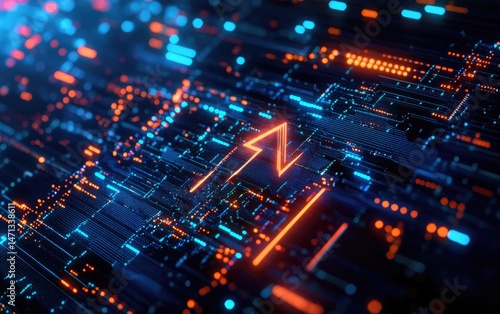 arrow, circuit, board, technology, digital, futuristic, glowing, neon, orange, blue, line, network, datum, connection, abstract, electric, energy, power, speed, fast, innovation, progress, growth, upward, movement, signal, communication, information, system, interface, design, graphic, background, illustration, modern, vibrant, bright, dynamic, complex, intricate, pattern, texture, light, dark, pixel, wire, electronic, hardware, software