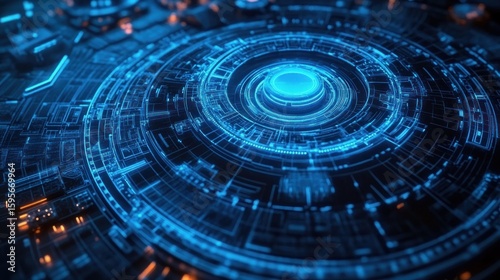 Glowing blue and orange circular digital interface with intricate futuristic technology patterns and layered concentric rings emitting light