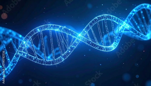 Glowing blue digital depiction of a double-helix DNA structure, illuminated with light particles against a dark backdrop