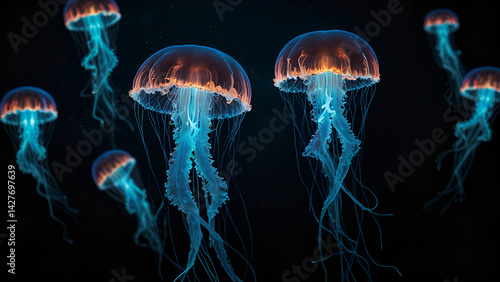 Glowing blue jellyfish with translucent bodies and trailing tentacles drift in a dark ocean creating an ethereal mesmerizing underwater scene with bioluminescent contrast