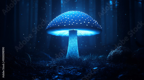 Glowing blue mushroom illuminated in a dark forest at night creating a magical atmosphere
