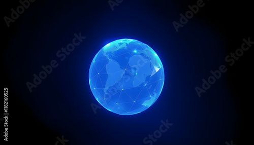 Glowing blue polygonal globe hologram on dark backdrop. 3D Rendering, vintage, with white tones