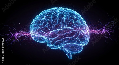 brain, nerve cell, neural, network, science, technology, mind, intelligence, thought, anatomy, biology, health care, medicine, futuristic, digital, illustration, glowing, light, energy, connection, communication, abstract, concept, idea, innovation, creativity, thinking, learning, cognition, insight, understanding, development, research, study, analysis, visualisation, structure, pattern, design, artistic, modern, contemporary, dark, blue, purple, spark, sparkle
