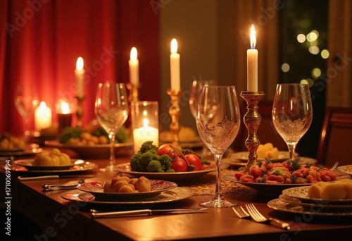 Glowing Candles Illuminating Festive Dinner Table with Vibrant Dishes and Elegant Decor for an Enchanting Celebration