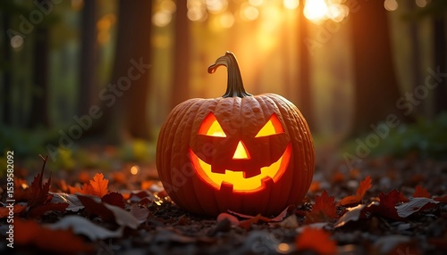 Glowing carved Halloween pumpkin jack-o-lantern on forest floor with autumn leaves and sunlight