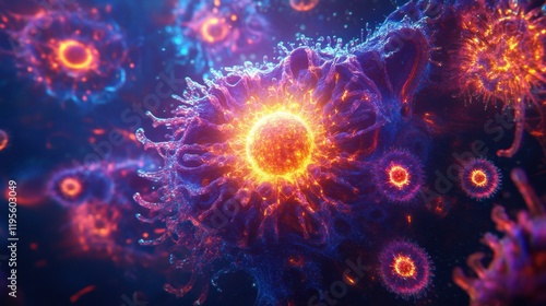 mobile phone, virus, microscopic, glowing, biology, immune, response, infection, laboratory, science, health, illumination, conflict, disease, nature, structure, experiment, visual, digital, art, attack, cellular, vibrant, colourful, network, energy, interaction, representation, environment, research, study, observation, detail, model, technology, animation, optical, medicals, illustration, generative, ai