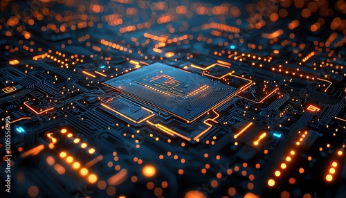Glowing circuit board patterns in a dark background, tech glowtime, modern and sleek design