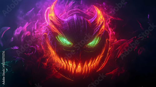 glowing, monster, design, horror, dark, surreal, shadow, evil, smoke, face, scarey, graphic, digital artwork, daemon, fantasy, abstract, fantasy art, digital, halloween, creepy, three-dimensional, fire, night, green, purple, abstract art, graphic design, illustration, art, aesthetic, red, nightmare, skittish, render, black, darkness, horn