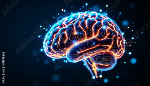 Glowing digital brain, neural network, abstract background, AI concept, technology illustration
