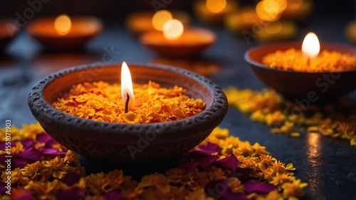 hanukka, oil lamp, light, hindu, holiday, celebration, india, indian culture, festive, background, bokeh, vibrant, decoration, spiritual, religion, tradition, hope, joy, flames, flower, marigold, flower petals, night, dark, macro, closeup, abstract, art, worship, pattern, rangoli, greeting card, fire, hinduism, culture, warm, glowing, beautiful, peaceful, copy space, wallpaper, banner, design