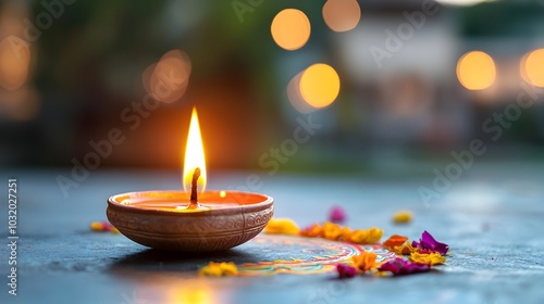 Glowing diya oil lamp illuminates a vibrant and colorful rangoli design on the floor during the Hindu festival of Diwali