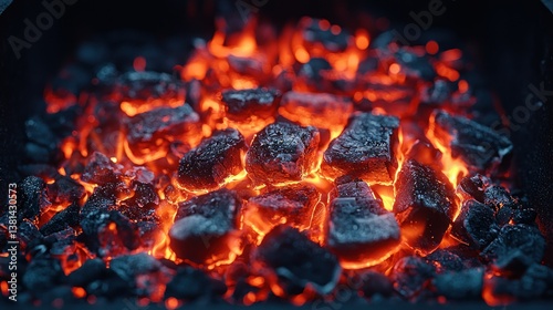 Glowing Embers: A fiery close-up of burning charcoal, intense heat and energy radiating from the heart of the fire.