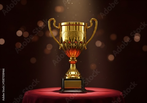 trophy, gold, award, velvet, dais, spotlight, bokeh, celebration, success, winner, achievement, symbol, shiny, luxury, glow, stage, red, competition, honour, event, background
