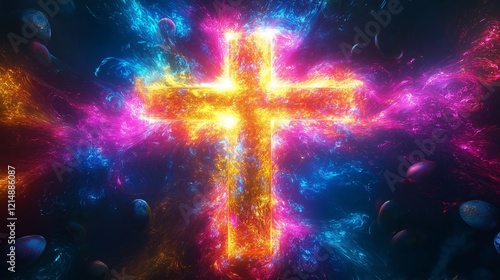 Glowing golden cross surrounded by stars and cosmic light patterns. Spirituality and faith concept. High quality illustration