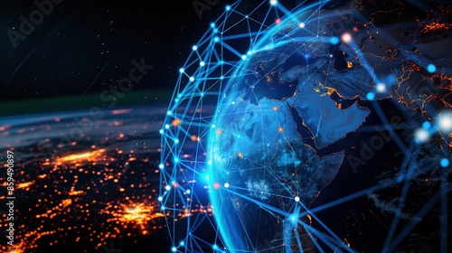 glowing holographic cellular network covering digital image of earth, futuristic and technological background