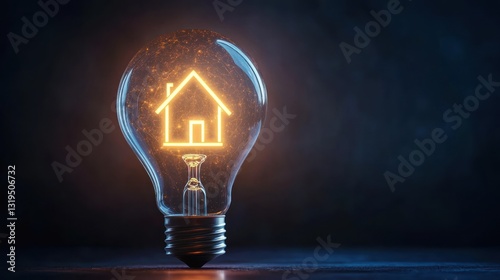 Glowing house icon inside a lightbulb illuminates a dark interior. Concept of home ideas